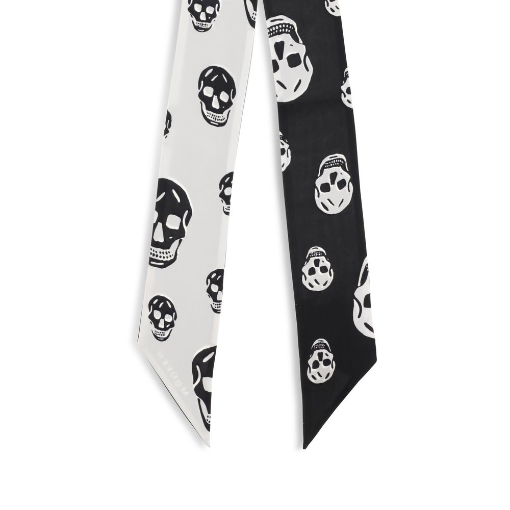 The Skull Ribbon Scarf by Alexander McQueen is made of silk twill with an all-over black and ivory Skull pattern. Finished with the McQueen logo on the bottom, it can be wrapped around the wrist or over bags from the collection, adding a distinctive and versatile touch to the look.