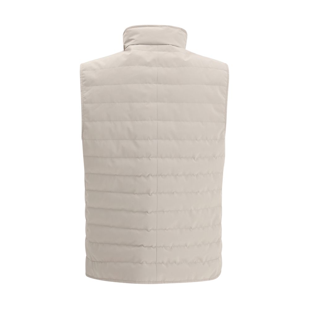 The quilted Vest Jacket by Brunello Cucinelli features refined padding that offers both lightness and warmth. The design includes a front closure with a two-way zipper, two welt pockets on the front, and a slightly raised collar that adds elegance and protection. A versatile and sophisticated piece, ideal for completing both casual and more polished looks.