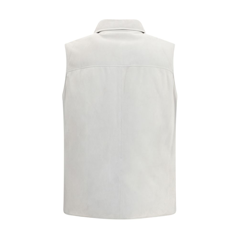 Brunello Cucinelli’s padded leather Vest is a sophisticated garment that combines elegance and functionality. Made of soft leather, it features a snap-button closure and a shirt-style collar that enhances the tailored design. The breast pocket and welt pockets with snap button add practicality without sacrificing style. Inside, two button-fastening pockets and a pen pocket complete the structure. Fine goose down filling ensures warmth and comfort, making the vest ideal for colder seasons.