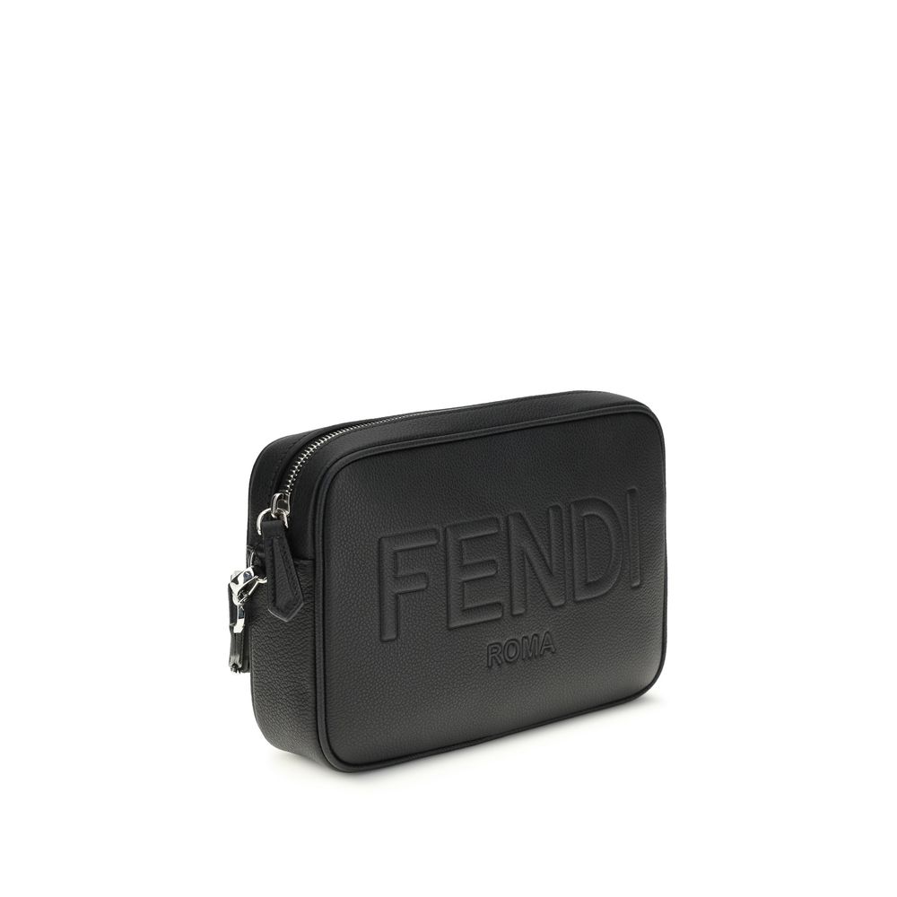 Camera Shoulder Bag by Fendi, top zipper closure, removable and adjustable flat nylon shoulder strap, iconic embossed Fendi Roma logo on front, garnet design, slit pocket on back, single interior compartment.